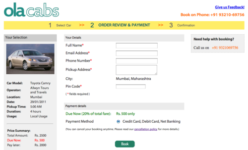 Up untill now, you could search for a car rental online at Olacabs.com but you had to call us to book. Now you can just pay online and get instant confirmation of the car you are booking! We’ve partnered with EBS, one of India’s most trusted and reliable payment gateway providers. We now accept payments through Credit Cards, Debit Cards, Net Banking and Cash Cards!